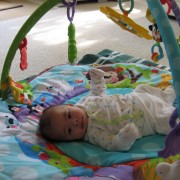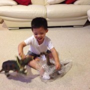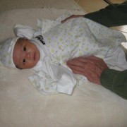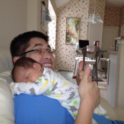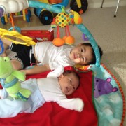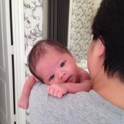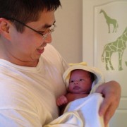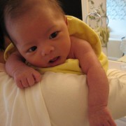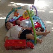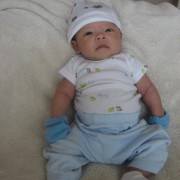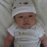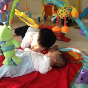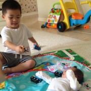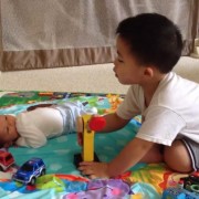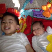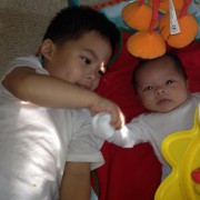 Ngày 7/6/2012 em mới được 3 tuần tuổi và ngoan lắm. Em ngủ nhiều hơn con. Con 3 tuần tuổi chỉ thích mở mắt dòm mọi người đi qua lại. Giờ thì con hay rủ em chơi, 'Baby, you want to play train?' 'You want to play cars?' Ba Mẹ tắm em là con hỏi, 'Daddy, can i help?' Phụ hứng nước tắm em xong con nói với Ba Mẹ, 'Call me if you need help, okay?'...Hihi, à, đố biết ai đây? Em cũng thích đi tắm như con, không khóc chút nào. Ngày 7/14/2012 em đầy tháng. Nhà mình không làm tiệc gì, chỉ chụp hình kỷ niệm thôi. Hình này lúc con được 2 tuần nè. Bây giờ thấy Mẹ chụp với em cũng nhào lên đòi chụp. Còn đây là lúc con 3 tháng, chuẩn bị lật. Giờ thì nằm tràn ra khỏi miếng lót luôn. Thấy em nằm chơi là nhào tới nằm kế bên. Tội nghiệp con, từ khi làm anh là hay bị la, ồn ào quá, em ngủ... Con làm gì em cũng nhìn theo. Anh Hai ưa chơi khủng long lắm. Chừng nào em mới bằng anh Hai đây... Chơi chút thôi rồi ngủ khèo.  Ba nói em êm như con mèo, ẵm phê lắm. Buổi sáng em cũng hay cười như con. Không ngờ có ngày con làm anh của em Cúc Ky dễ thương này hén. Ba Mẹ cứ lo không biết con có ghét em không... ...nhưng mà con thương em lắm, tự động lại hun em. Làm anh hơi mệt chút nhưng mà dễ ợt con hén?