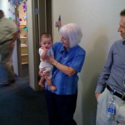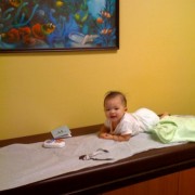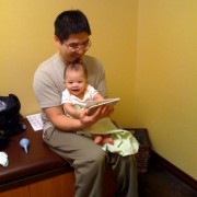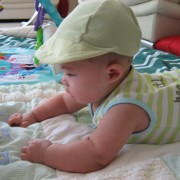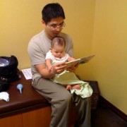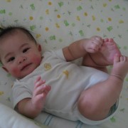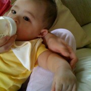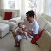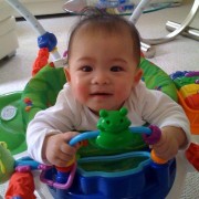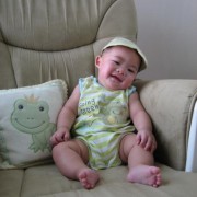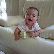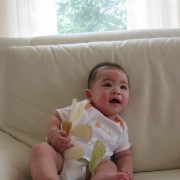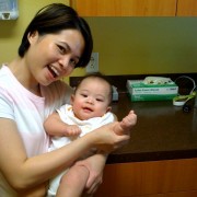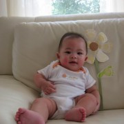 Hè này con làm cái bông mừng sinh nhật Bà Nội Lúc mới làm xong thì đẹp lắm, một hồi sau thì gần rách vì con muốn ăn cái bông Ba Mẹ vội vàng lấy lại để chụp hình tặng Nội. Con chẳng phản đối gì, còn cười cho Mẹ chụp hình nữa Ba Mẹ chở con tới công ty chơi. Ai cũng bồng con được. từ người nhỏ như bà Susie... ...tới ông bự Bernard.. ...và cười với mọi người nữa. Con thiệt là ngoan. Sau đó thì đi bác sĩ khám định kỳ và chích ngừa. Mình lấy hẹn gần giờ đóng cửa nên vắng người. Vô tới phòng khám rồi. Mẹ con mình lựa sách coi, đợi y tá tới ha? Con đọc sách với Ba, hình như là thích lắm vì khác với sách mình có ở nhà Mẹ gọi Cúc Cu là con ngẩng đầu lên cười liền Cô y tá cân cho con 7.2kg, 65cm Cân đo xong thì bác sĩ vô khám. Con nằm yên không la khóc gì cả. Bác sĩ nói mọi thứ đều tốt. Bây giờ mình đợi y tá vô chích ngừa là xong Con về nhà là có đồ chơi mới này để chơi. Con thích cái này từ lâu rồi, vậy mà bây giờ mới đủ lớn để chơi Có đồ chơi này thì Ba Mẹ yên tâm con không lăn vòng vòng khắp nhà Con đang ăn carrots với Ba nè. Bắt đầu mùa hè này con ăn các loại rau củ ...nhưng vẩn bú 7 bình mỗi ngày Ông Tám tới chơi, con bắt đầu biết lạ rồi. Con dòm Ông Tám một hồi lâu mới cho bồng... ...sau đó thì cho Ông Tám đút luôn. Con ăn hết sạch Con vần thích coi tv với Mẹ như hồi hai tháng Giờ thì con bắt đầu biết cầm cái chân rồi. Tay trái cầm chân trái thôi à nghen. Con thích chơi với Ba lắm. Chơi cả tiếng đồng hồ không chán 'Thời trang mùa hè của con. Để đồ chơi trước mặt con mới nhìn nghiêng, không thì cứ dòm máy hình va cười thôi. Lần đầu tiên con mặc áo sát nách. Nhìn con xấu ghê, cục cưng ơi.